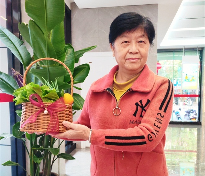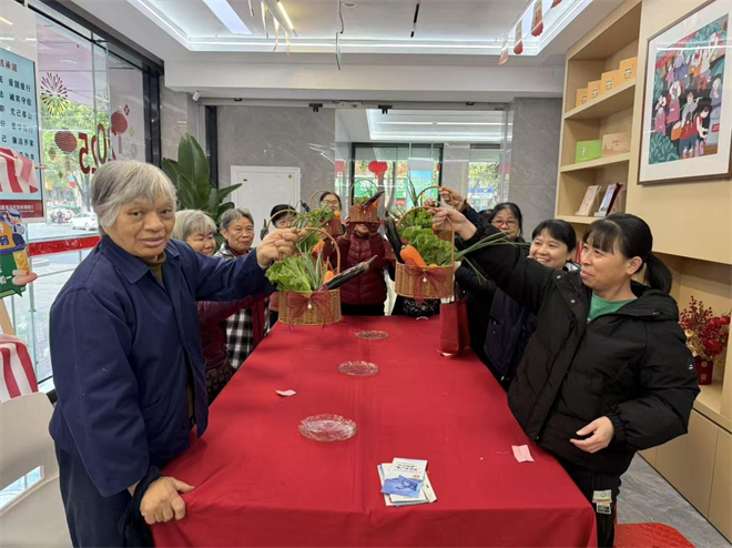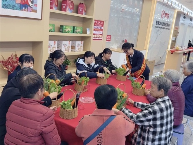 活动现场,银行工作人员将生菜、胡萝卜、葱段等家常蔬菜与藤编篮、装饰丝带组合,以“生菜寓意生财、葱段象征顺遂”的生活巧思,引导客户制作“生财花篮”。原本普通的食材,在客户手中变成了兼具吉祥寓意与生活趣味的创意作品。“来银行办社保卡,没想到还能亲手做个‘生财篮’,既好玩又讨彩头,感觉这里不光是办业务的地方,更像邻里聊天的小空间!”完成作品的李阿姨说,这份“带着烟火气的金融服务”让她印象深刻。