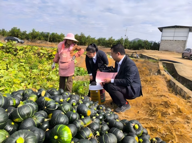 活动当天,客户经理们脚踩泥土,手持工具,走进田间地头俯身查看南瓜长势,帮助农户采摘成熟南瓜、搬运丰收成果,在共同劳作中迅速与农户拉近距离。在劳动过程中与农户们面对面拉家常、话发展,详细了解其种植规模、成本投入、资金需求以及金融服务诉求。针对农户的实际情况,结合南瓜种植周期性强、投入集中等特点,精准推荐该行适合的存贷产品,现场解答利率政策以及业务办理流程等疑问。通过实地走访和精准对接,桂林国民村镇银行将金融服务直接送到生产一线,在乡村振兴的广阔天地中深耕细作,让金融产品与服务真正扎根乡土。