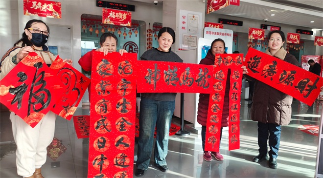 笔墨凝香迎新春,方寸红纸载深情。活动现场暖意融融、墨香四溢,该行特邀两位平遥县书协资深老师齐聚营业厅,铺展大红宣纸、轻研浓醇墨汁、凝神静气运笔,以笔为媒、以字传情,将新春的美好祝愿尽数凝于笔端。一横一竖沉稳有力,一撇一捺气韵生动,一笔一划间尽显书法魅力,一字一句中饱含真挚祝福。