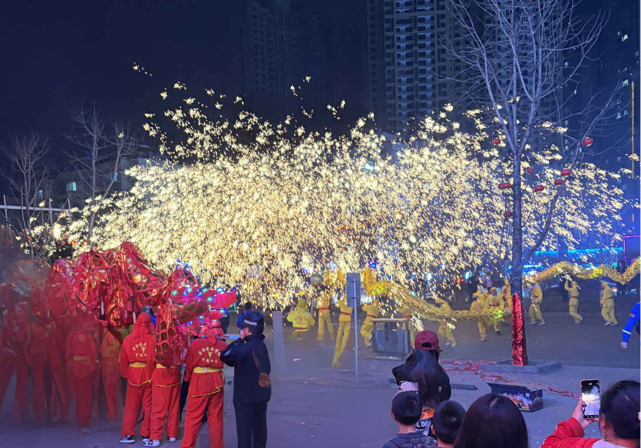 在漫天飞舞的“铁水流星”映衬下,金色祥龙穿梭其中,时而在火雨中盘旋游走,时而昂首腾跃。火龙与金花交相辉映,呈现出“人在龙中舞,龙在火中飞”的壮观景象,引来现场群众阵阵惊呼与喝彩,大家纷纷举起手机,记录下这精彩绝伦的瞬间。
