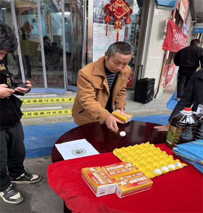 集市喧嚣,烟火升腾。近日,大方富民村镇银行马场支行趁着热闹的赶集日,在街头支起小摊,玩起了“乒乓球跳鸡蛋托”的趣味挑战,把金融宣传巧妙地融进了欢声笑语里。