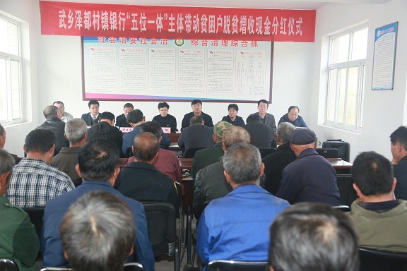 10月20日,武乡泽都村镇银行“五位一体”主体带动贫困户脱贫增收现金分红仪式在故县乡五村村委会举行。副县长张帆、郑丹出席,县直相关部门负责人,泽都村镇银行董事长侯红伟,洪水镇、韩北乡、墨镫乡、故县乡分管领导,贫困户代表参加。分红仪式由故县乡党委书记石永兵主持。