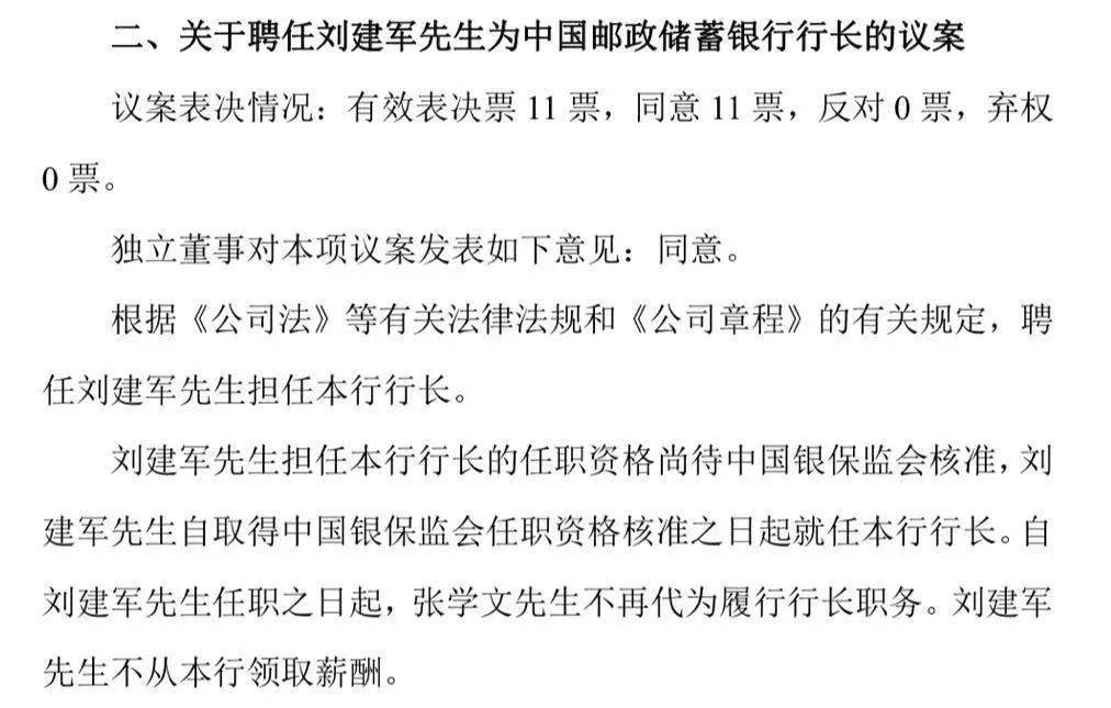 5月31日晚,邮储银行发布《董事会决议公告》,董事会审议并表决通过了提名刘建军为中国邮政储蓄银行执行董事候选人、聘任刘建军为中国邮政储蓄银行行长、调整董事会专门委员会人员组成等议案。空缺了近5个月的邮储银行行长一职尘埃落定,刘建军成为首位由招行赴任国有大行行长的高管。