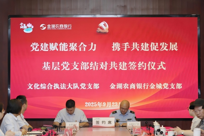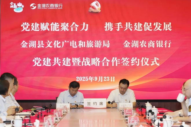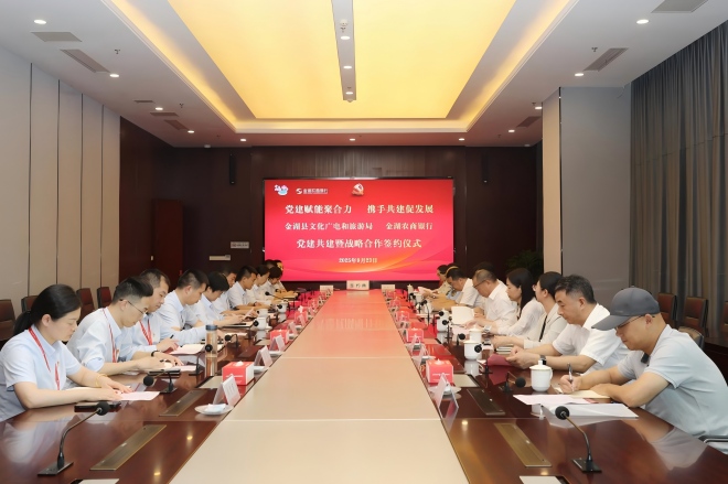 9月23日下午,金湖县文化广电和旅游局与金湖农商银行举行党建共建暨战略合作签约仪式,双方约定持续深化党建与业务融合,共同探索一条党建引领有力、金融服务温馨、文旅发展提速的协同共进新路子。金湖县文化广电和旅游局党组书记、局长闵江,其他领导班子成员及相关支部书记,金湖农商银行党委书记夏浩博及相关领导班子成员,相关支行、部室负责人出席签约仪式。活动由金湖农商银行党委副书记、行长邱驰主持。